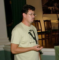 На аудиокниге звучит голос молодого белорусского литератора Андрея Ходоновича. Именно он озвучил поэтический текст, и именно он был ведущим вечера.