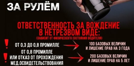 Напоминаем, что согласно измененному Кодексу Республики Беларусь об административных правонарушениях, ответственность за езду в нетрезвом виде зависит от физического состояния водителя. Если в его выдыхаемом воздухе содержится до 0,8 промилле алкоголя, то водителю грозит штраф в размере 100 базовых величин и лишение права управления сроком на 3 года. Если свыше 0,8 или водитель отказывается от прохождения медицинского освидельствования – штраф составит 200 базовых величин и водитель лишится права управления транспортом уже на 5 лет.